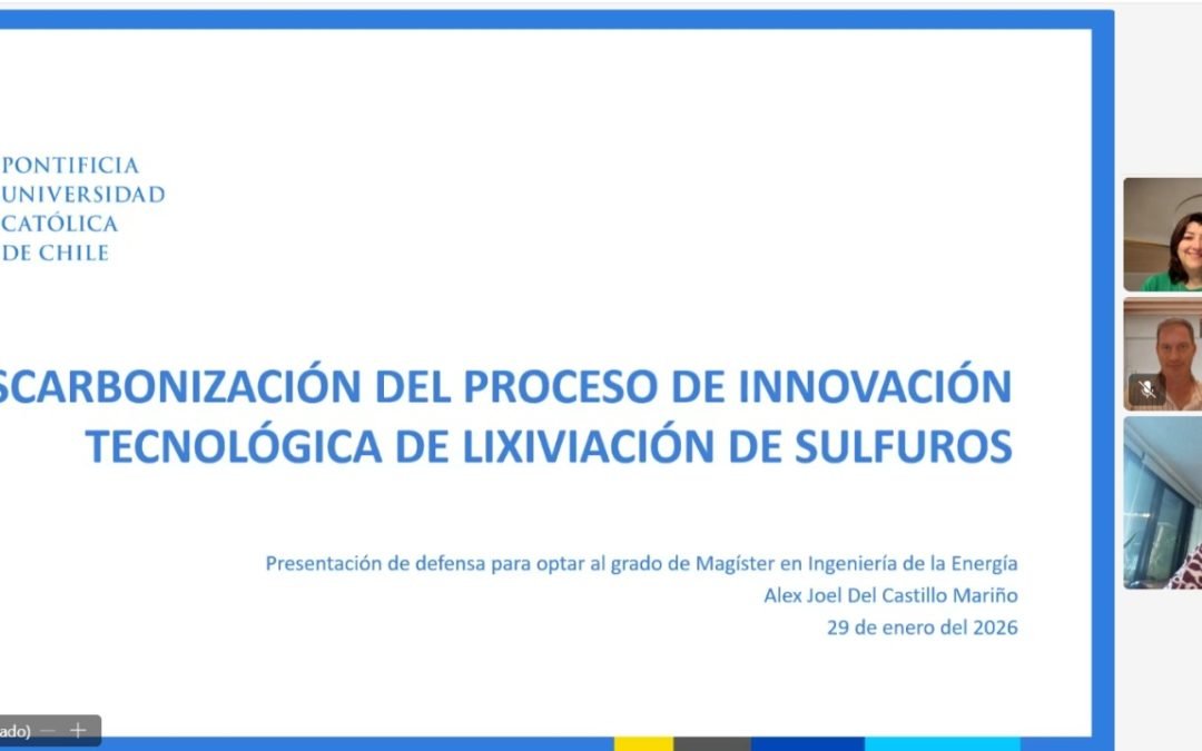Con el título de su Actividad de Graduación: “Descarbonización del proceso de innovación tecnológica de lixiviación de sulfuros”, Alex Joel Del Castillo Mariño se convirtió en un nuevo graduado del Magíster en Ingeniería de la Energía de la Pontificia Universidad Católica de Chile.